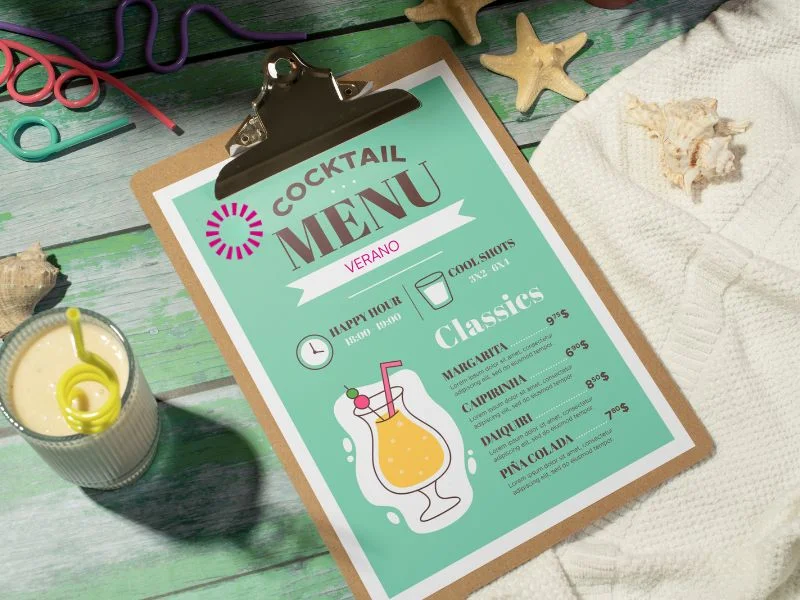 - Mejora en la actitud de los clientes: El ambiente de un negocio tiene un impacto directo en la actitud de los clientes. La decoración veraniega puede hacer que los clientes se sientan más relajados y felices. Cuando los clientes están de buen humor, son más propensos a interactuar positivamente con el personal, permanecer más tiempo en la tienda y, por ende, comprar más productos. Elementos como carteles, tarjetas de presentación, menús, flyers y folletos con temática veraniega pueden contribuir significativamente a crear este ambiente positivo.