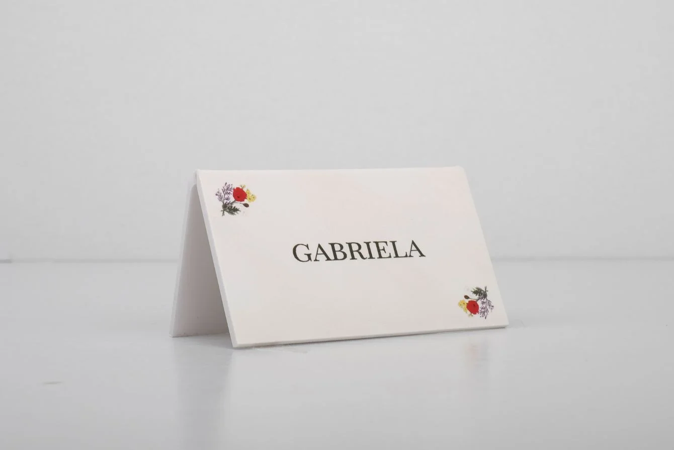 - Cartel de PVC en dos tamaños ( 15x6 cm o 15x8 cm) para colocar sobre la mesa. En PVC (Forex) doblado por la mitad formando una V invertida.