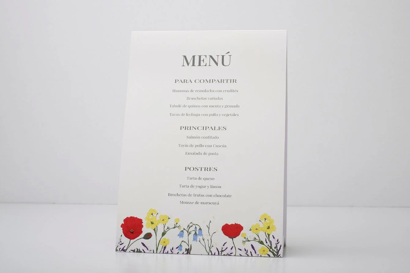- Table tent cartulina: Realizada en estucado mate de 350 gr, hendido y plegado, para un fácil montaje.