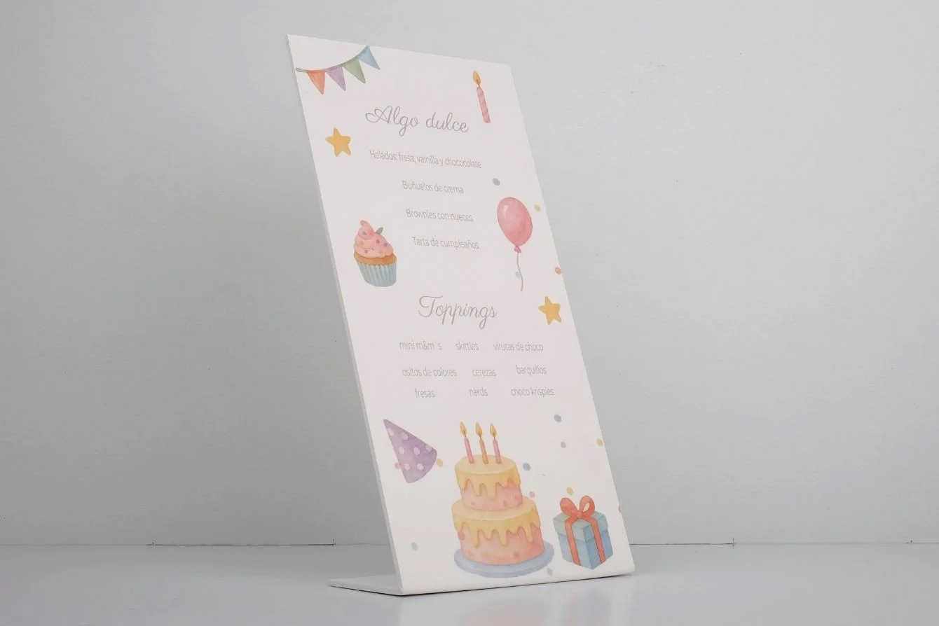 - Table tent A5: Carta portátil de PVC (Forex) de 3mm doblada en L en tamaño A5. Impresa en una cara CMYK.