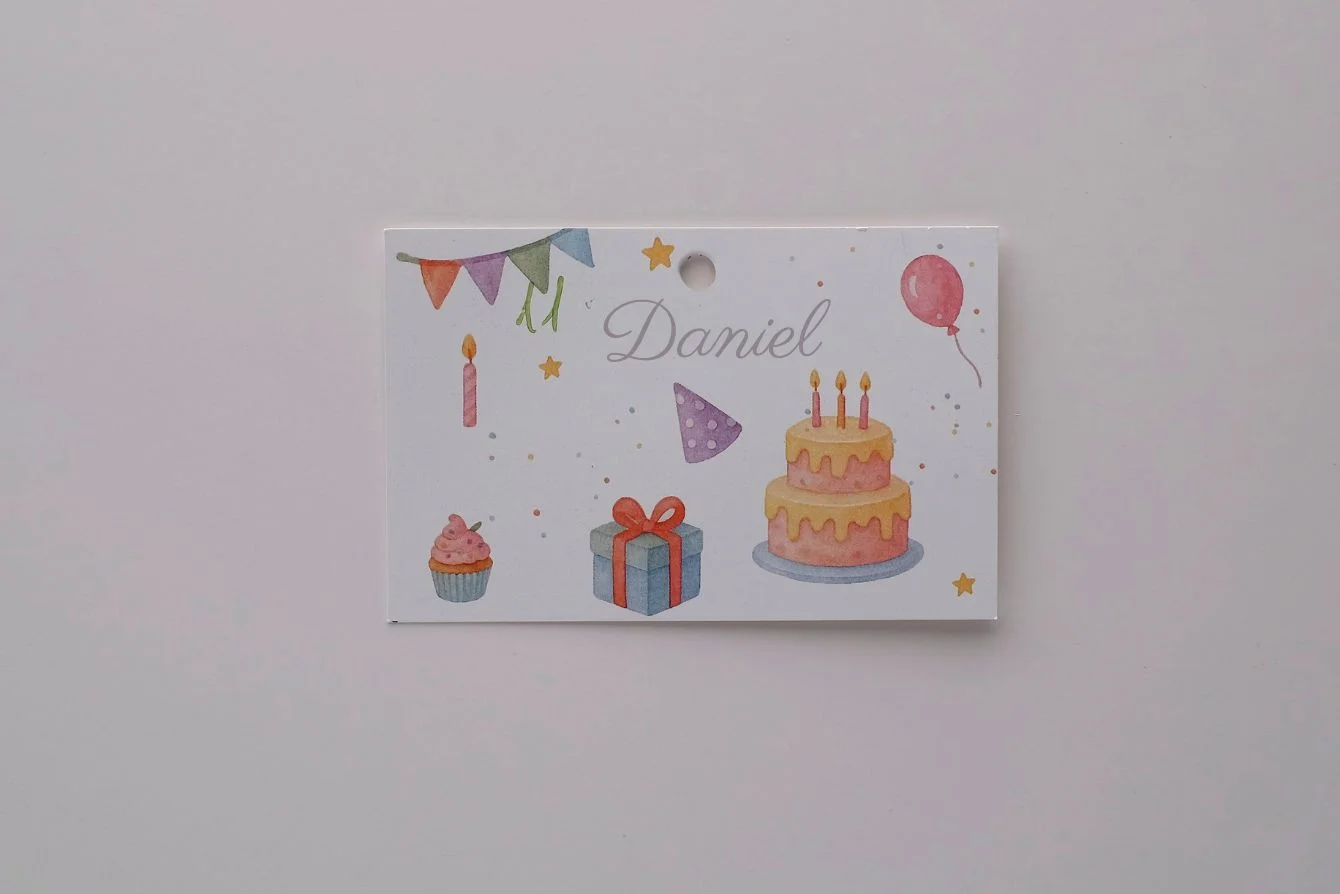 - Etiqueta con taladro troquelada con forma suave: de 8.5x5.5 cm realizada en 350 gr. mate, impresa a dos caras a todo color, troquelada con forma suave y taladro para colgar.